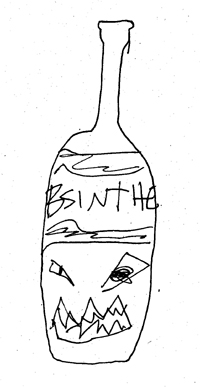 Absinthe Denne grufulle flasken av avsky og hat er musen! Slik muser gjør lover den deg kjærlighet og bunnløs inspirasjon og geni, men dreper heller sjelen din, slik at du haltende og hikstende sleper deg omkring i Helvetes korridorer med din bråkete fjærpenn som ler av deg og erter deg og skjærer seg inn i hånden din, og du produserer kun grønt, platt slim og oppkast! Den grønne fe symboliserer den uendelige smerten av å aldri oppnå noe og alltid være den samme, uavhengig av hvor mye hud du skraper av fra armen din med en rusten gaffel. |